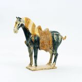 China. Tang Dynasty or Time of the Five Dynasties, 8th-10th cent. Burnt clay, hollow inside, three colour glaze (sancai). H. 38,5 cm. Standing on a rectangular plinth, with a slender head and long mane, saddle with high gussets and fur saddlecloth, the bridle decorated with palmettes and shell-like pendants, the tail tied with ribbons, covered with a three-color glaze (sancai) - Expertise: The TL report by the Ralf Kotalla laboratory, Haigerloch, dated March 2nd, 2023, dates the last time of firing of the object to the year 853 AD (+/-14.5%) - Provenance: South-German private collection -