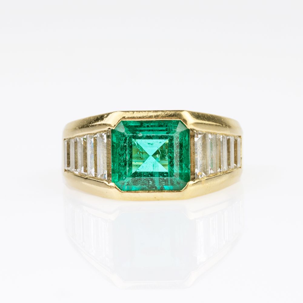 18 ct. yellow gold. The highquality, colour intensive emerald in octogonal cut 1,939 ct. (7.79 x 7.43 x 4.57 mm). The ring with 10 diam. in baguette cut in total approx. 1,79 ct. Rare White(F/G9.vvs. Inside tension ring for changing size. Size approx. 46-47, weight approx. 6,4 g. Details according to SSEF Experitse dated May 1990 and Mersmann Lugano valuation of insureance of 55.000 Fr. dated July 1990. -