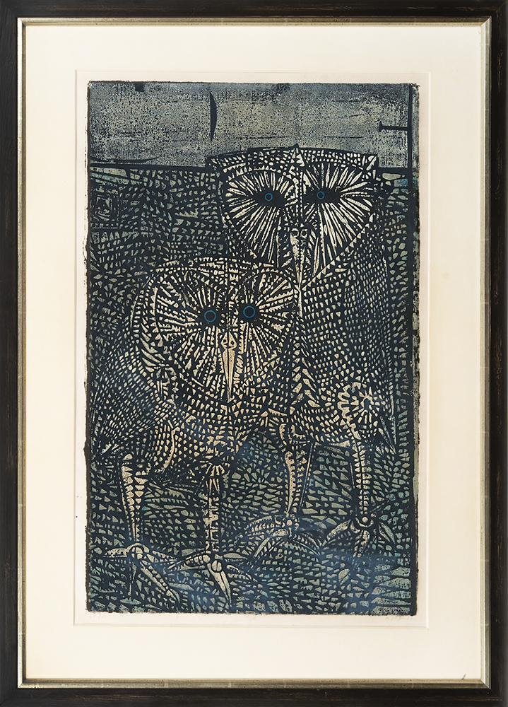1957. Woodcut in colours. 80 x 50 cm. Lo. ri. autographed and dat. H. Janssen 57, lo. le. num. 25/12, matted and framed under glass, uninspected out of frame. - One of the most important modern German draughtsmen and graphic artists. J. studied at the Hamburg Landeskunstschule in A. Mahlau's classes of liberal and applied arts. He merged the traditions of the Old Masters and the achievements of modernism to create his own pictorial language. Mus.: Hamburg (Kunsthalle), Oldenburg a. others. Lit.: Der Neue Rump, Blessin: H. J. Leben und Werk a. others.