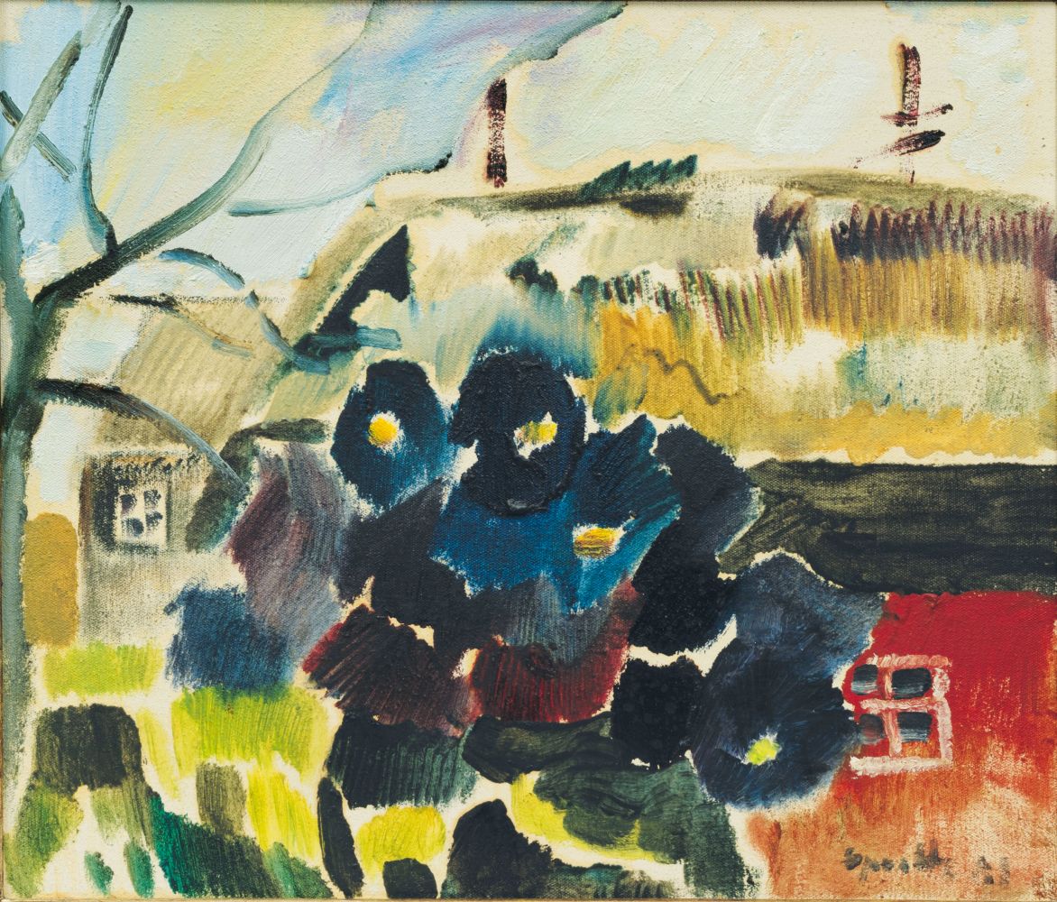 1981. Oil and sand/canvas. 42 x 48,5 cm. Original frame. Lo. ri. sign. Sprotte 81, titled on the frame. - Painter and draughtsman with background of philosophical aesthetics. S. was pupil of Emil Orlik in Berlin and master student of Karl Hagemeister in Werder/Havel. He worked and lived in Kampen on Sylt, where he became a central figure of artistic life. Mus.: San Francisco (Museum of Modern Art), Shanghai, Moscow, Stuttgart, Husum a. others. Lit.: Vollmer a. others.