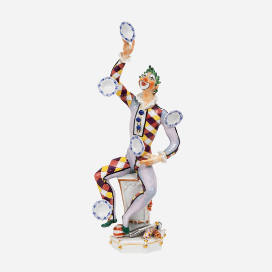 Meissen. 1976. Porcelain, polychrome and golden painting. H. 26,8 cm. Crossed swords mark, model no. '60460'. Clown juggling with 5 plates - German sculptor and porcelain modeler, studied at the Dresden Academy and was from 1973 until 2001 artistic director of the Meissen manufactory where he influenced substantially the artistic program. Since 2001 he worked as a freelancer and created numerous models for the Schwarzburger Werkstätten and the manufactory of Volkstedt-Rudolstadt.