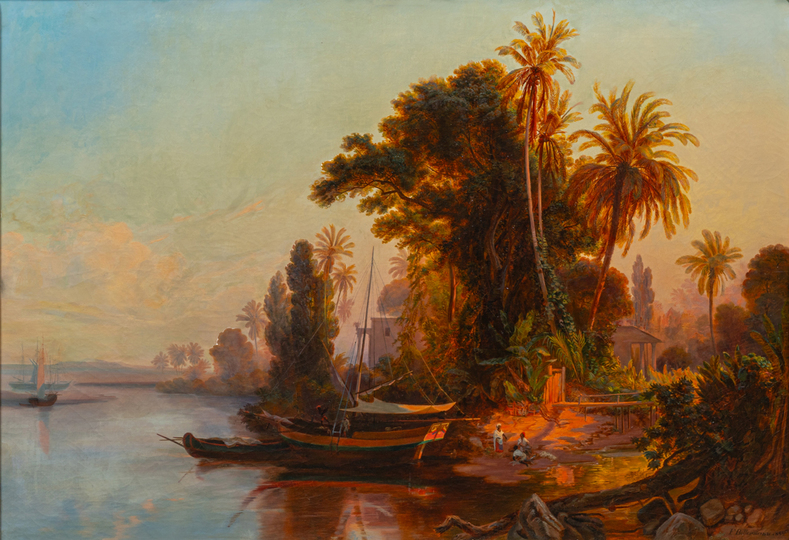1850. Oil/canvas. 93 x 128 cm. Lo. ri. sign. and dat. F. Bellermann 1850. Rest. - German landscape painter. B. studied at the drawing school in Weimar and the academy in Berlin under K. Blechen and A. W. Schirmer. He then went on study trips, sometimes accompanied by P. C. Schreiber and Fr. Preller, through Germany, to Belgium, the Netherlands and Norway. B.'s accuracy both in the depiction of the landscape and of individual plants earned him a travel scholarship to Venezuela arranged by A. von Humboldt. After his return, he became a professor in 1857 and succeeded Schirmer in Berlin in 1866, where the Prussian royal family became an important customer for his paintings through Humboldt. He exhibited in numerous German cities and at the world exhibitions in Paris and Vienna. Starting out from an academic style, B. developed a looser style of painting over the course of his career, without becoming unfaithful to the precision already evident in his early work. Mus.: Berlin (Nat.-Gal., Kupferstichkabinett), Potsdam, Erfurt, Schwerin, Celle, Altenburg. Lit.: Thieme-Becker, Bénézit.
