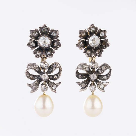 End 19th cent. 14 ct. roségold with silver. Flower shaped top and bow shaped pendants with all together 54 rose cut diam. (in the center diam. diameter approx. 4,8 mm). As pendant with one natural, creme white pear shaped natural pearl (9 x 8 mm, salt water pearls, no traces of cultured pearl nucleas). Clip hook with screwable slider added, marked 585. 38 x 15 mm, weight approx. 11,6 g. we thank the Gemmologisches Institut Hamburg for the information referring the pearls. -