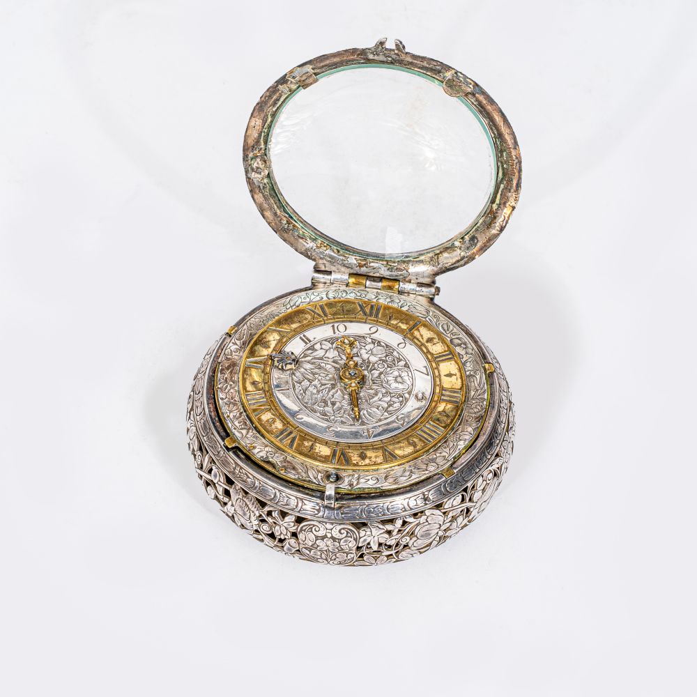 Paris. Sec. half 17th cent. Silber and brass dial, one central hand, alarm plate with arab. numerals 1-11, strike on bell, platine with carvings, parts of signature. Verge watch with fusee drive, small damages, additions, momentarily not running. Outer diameter 92 mm, weight approx. 739 g. -