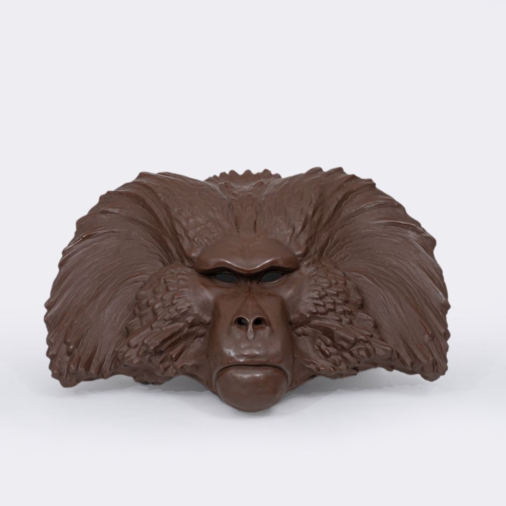 Meissen. Designed 1923, made after 1973. Böttger Stoneware. H. 37 x B. 46 cm. Crossed swords mark, incised BÖTTGER STEINZEUG, Modellno. 86006, limited edition 19/25 (gold). Expressive, stylized mask of a mantled baboon with a shaggy mane, closed mouth and deep-set eyes. It is one of the most expressive animal masks by the artist, who, in addition to the mask of the mantled baboon, also modeled an orangutan, tiger or ram mask for the Meissen manufactory