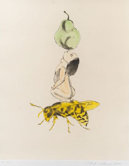 Cornelia Schleime: Untitled (Kneeling Nude with Pear and Wasp)