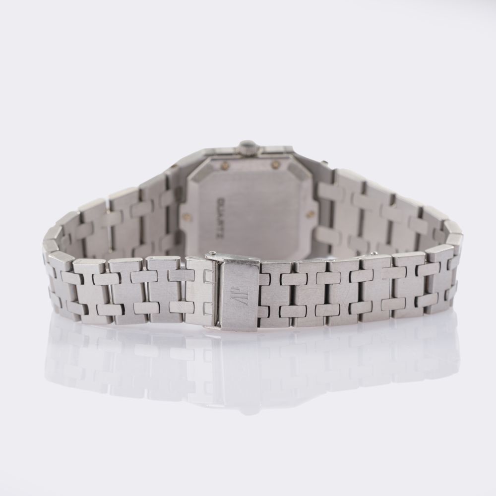 1980's. Stainless steel, quartz, ref. 6009ST. Dark grey dial, silver-coloured hands and indices, marked 'Audemars Piguet Swiss', sapphire crystal. Verso stainless steel, marked 'Quartz B69906'. Integrated stainless steel bracelet with AP folding clasp. Dm. 25 x 34 mm, weight approx. 58 g. -