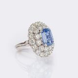 18 ct. white gold. In prong setting in the centre natural blue sapphire in step-cut of 6.95 ct. (12.24 x 10.33 x 5.48 mm), no indications of heat treatment, origin Sri Lanka. Ring head further set with 28 round brilliant cut diamonds totalling 4.93 ct, Rare White(G) - White (H), VVS-SI. Ring head approx. 27 x 25 mm, size 53, weight approx. 14.1 g. Data according to GRS and IGN expertises of 2024 and 2023. -