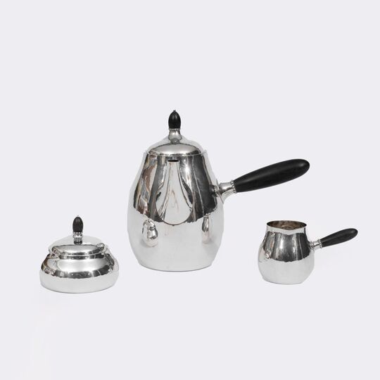 Copenhagen. Designed 1915, made 1945-77. Sterling silver, marked DENMARK STERLING, manufactory mark GEORG JENSEN, design no. 80 A/B. Slightly hammered surfaces, partly ebonized wooden handles and knobs. Jug: H. 17 cm, cream jug: H. 6 cm, sugar bowl: Dm. 9 cm. Weight approx. 800 g (incl. wooden handles and knobs) - Literature: Taylor/Laskey, p. 78 (here as 80B/C) - Danish silversmith, 1895-1901 Studies at the Royal Danish Academy of Art in Copenhagen, then worked in the studio of the Danish court jeweler Michelsen. In 1904 opening of his own studio in Copenhagen where Jensen first produced works in the Art Nouveau style. Soon after he founded the company Georg Jensen, which is famous for their designs in the functional style of the Danish industrial designs.