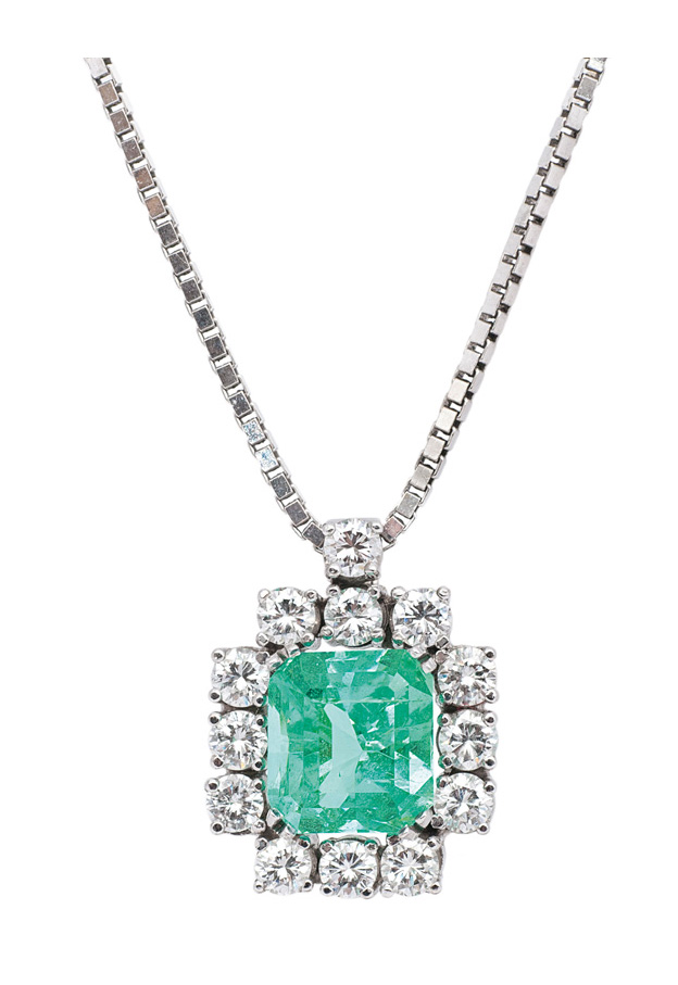 18 ct. white gold. The Colombian emerald in octagonal cut ca. 5,50 ct., framed by 13 round cut diam. in total c. 1,62 ct. H.si1-2. Pendant with eyelet 21 x 16 mm, necklace 14 ct. white gold l. 41,5 cm, weight ca. 11 g. Expertise of the Gemmologischen Institut Hamburg with replacement value of ca. 12.000 Euro.