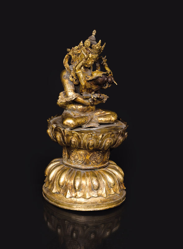 Nepal/Tibet, around 1900. Gilt bronze. Figure of Buddha Vajradhara in embrace with his consort (yab-yum). His crossed hands holding the ritual objects Vajra and Ghanta. On a tall lotus base with reliefs of the Buddhist symbols. H. 57 cm.