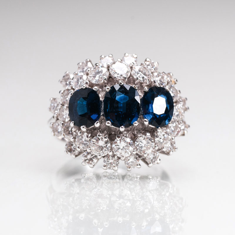 14 ct. white gold, marked. In front enlarged, in chaton and prong settings three sapphires in oval cut in total approx. 2,50 ct. and 32 round brillant cut in total approx. 2 ct. G-H.vvs-vs. In front w. 18 mm, size 54, weight approx. 5,5 g.