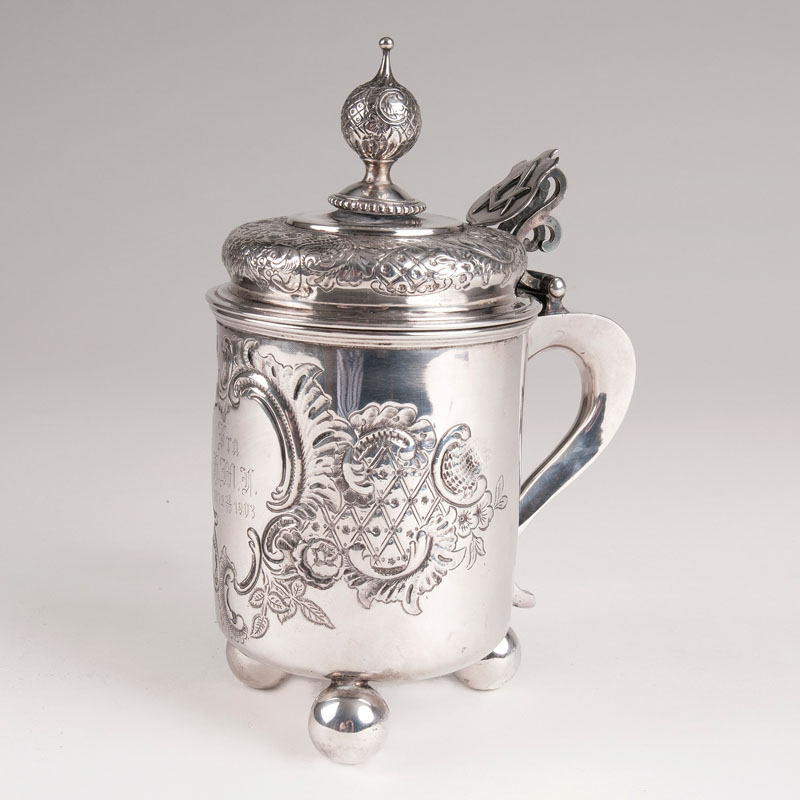Copenhagen, around 1900. Silver, stamped assay mark unclear, mm.: 'JG.P.S' for Jorgen P. Schmidt, marked 'JG.S'. Drum shape on 3 ball feet. Walls with floral decor, c-swings and a sceptre ball on the lid. H. 20,5 cm, approx. weight 470 g.