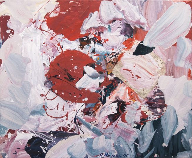 Acrylic and mixed media/canvas, 63 x 76 cm, lo. ri. sign. and dat. H. Naujoks 95. - German painter. N. took part in O. Kokoschkas 'Sommerakademie' in Salzburg in 1958 and in that same year began studying at the Munich academy. Mus.: Munich (Bayrische Staatsgem.-Sammlungen), Nuremberg, Emden, Schweinfurt a. others.