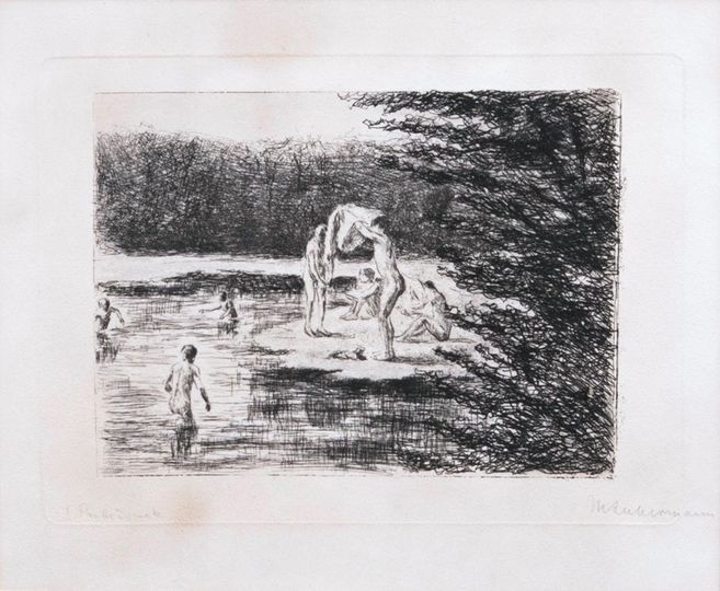 Etching, 14 x 19 cm, lo. ri. autographed M. Liebermann, lo. le. inscribed 'I. Probedruck', matted and framed under glass, uninspected out of frame. - One of the most important exponent of German impressionism. L. studied at the Berlin academy under C. Steffeck and at the Weimar academy under F. Pauwels. Since 1897 he was professor at the Berlin academy. He was also co-founder of the Berlin secession in 1898 and its president. Mus.: Hamburg (53 paintings in the Hamburger Kunsthalle), München, Hannover, Köln, New York a. others. Lit.: Thieme-Becker, Bénézit, Vollmer, Schiefler: M.L. - Sein graphisches Werk 1876-1923, Eberle: M.L. - Werkverzeichnis der Gemälde und Ölstudien a. others.