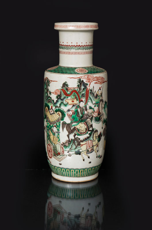 A tall 'Famille Verte' rouleau-vase with horsemen